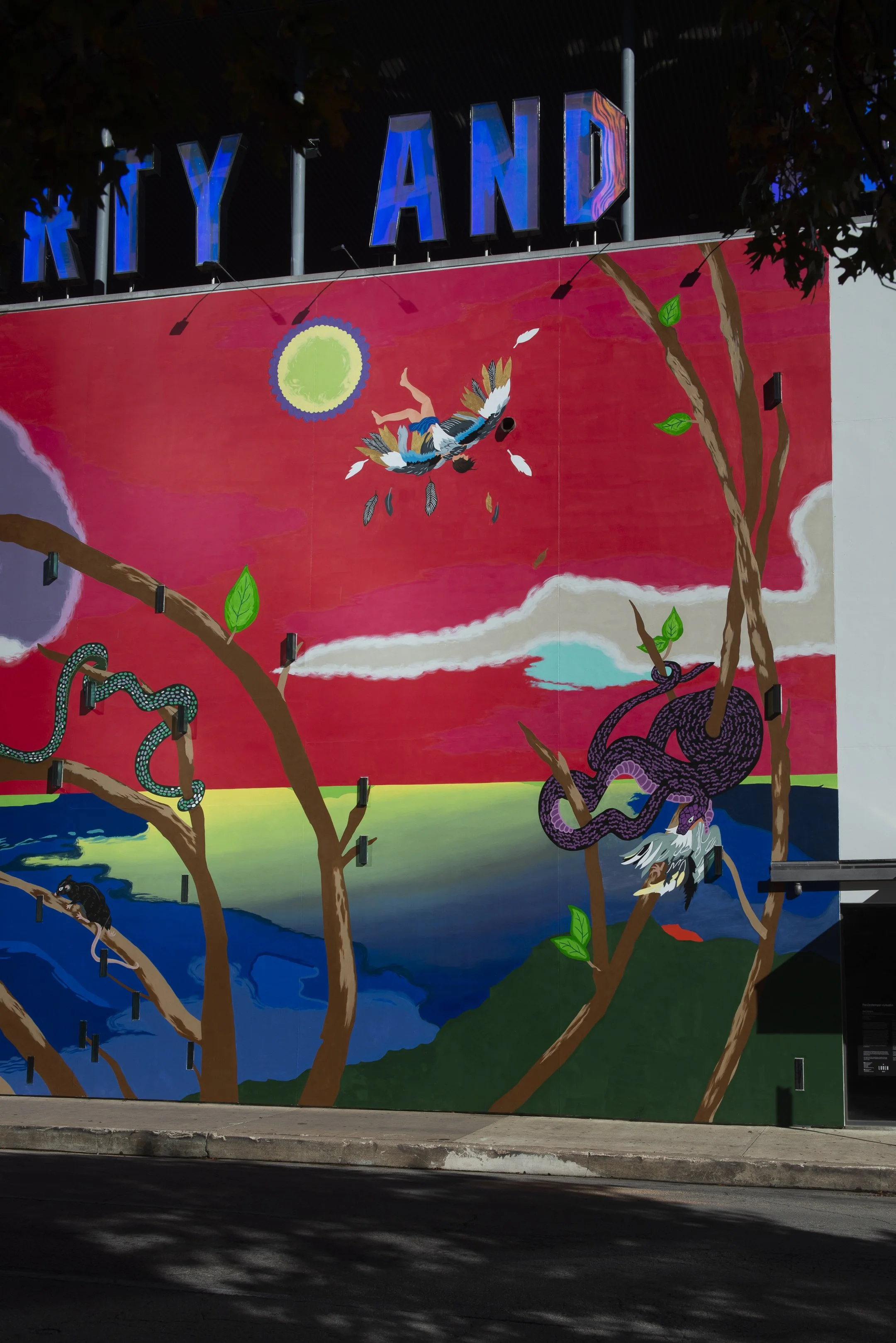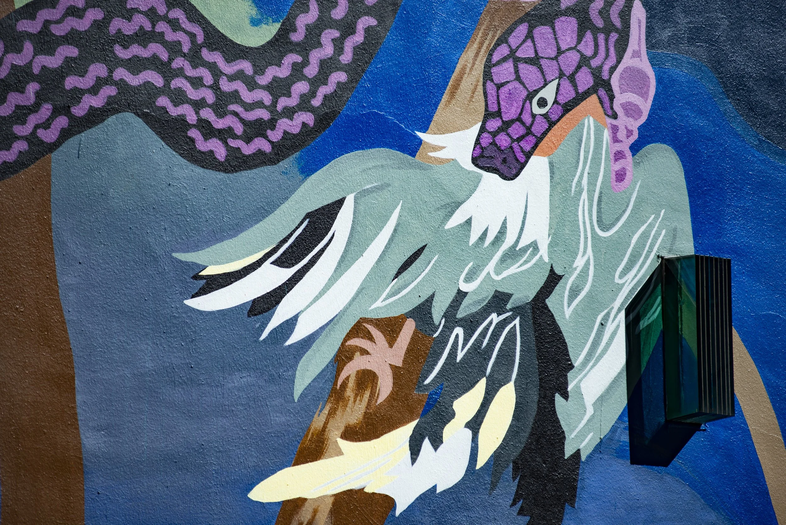 Manik Raj Nakra employs an ornate, imaginative style rooted in antiquity such as classical Indian iconography, the densely detailed imagery associated with Mughal painting, and architectural forms from the Roman Empire. His colorful and humorous scenarios depict interactions between humans deities, and animals that draw equally from ancient folklore and contemporary pop culture. In Man Who Fell to Earth, Nakra finds inspiration in the Greek myth of Icarus, whose hubris led him to dismiss warnings that his manmade, wax wings would melt if he flew too close to the sun. The mural’s title also pays homage to the 1976 film “The Man Who Fell to Earth,” in which David Bowie portrays an alien seeking water for his home planet, which is suffering from severe drought. In this panoramic scene, viewers are positioned amongst a group of animals, including a snake, a rat, and, at the center, a leopard, who watch the events transpire from afar. Nakra often uses exotic animals, particularly jungle cats, as stand-ins for the violence and greed of human history, colonial domination, and the exploitation of natural resources. Whether this scene can be read as a commentary on imperialism’s effects on the environment or a hopeful vision of a landscape on the precipice of returning to nature remains up for interpretation.