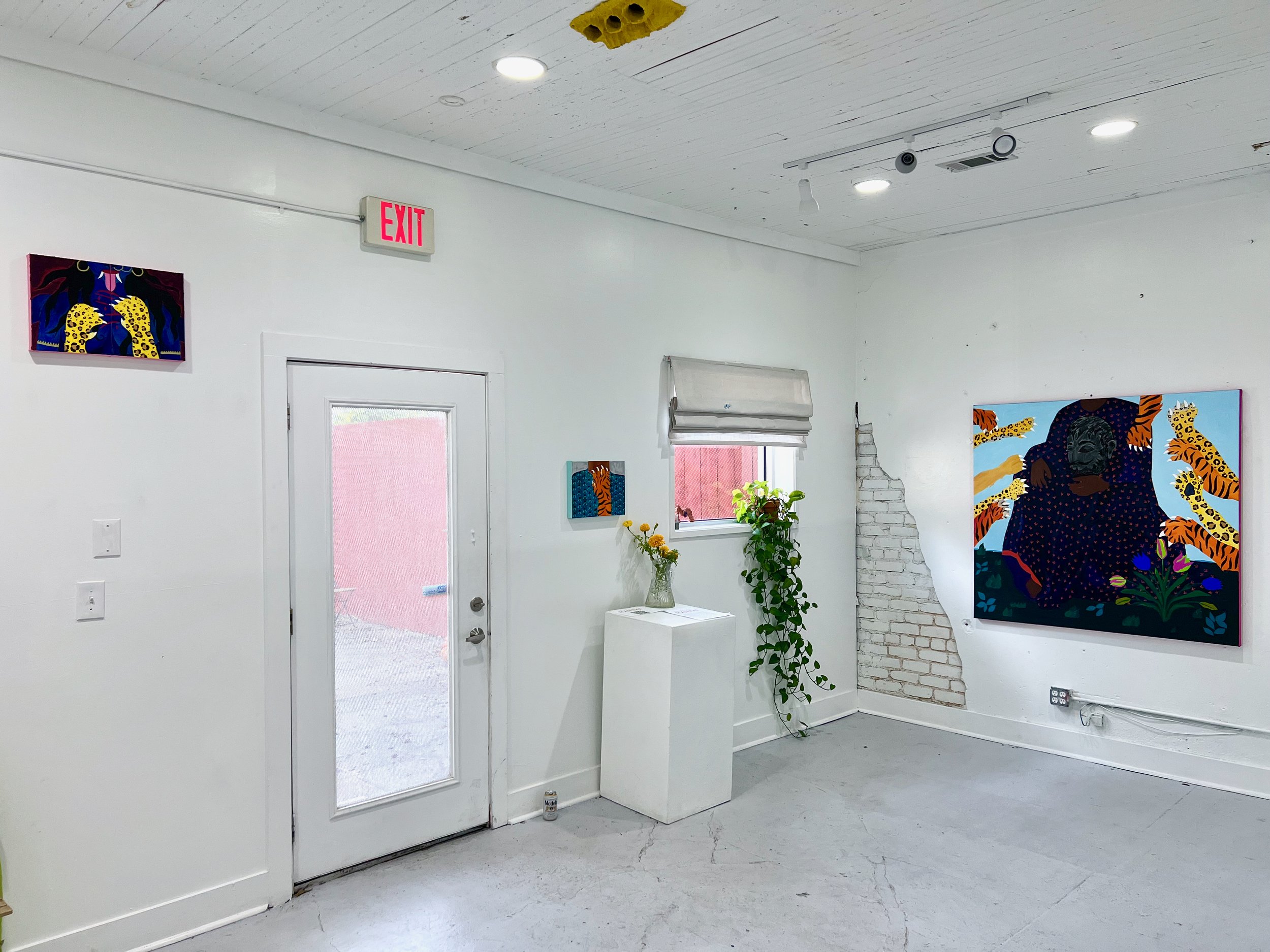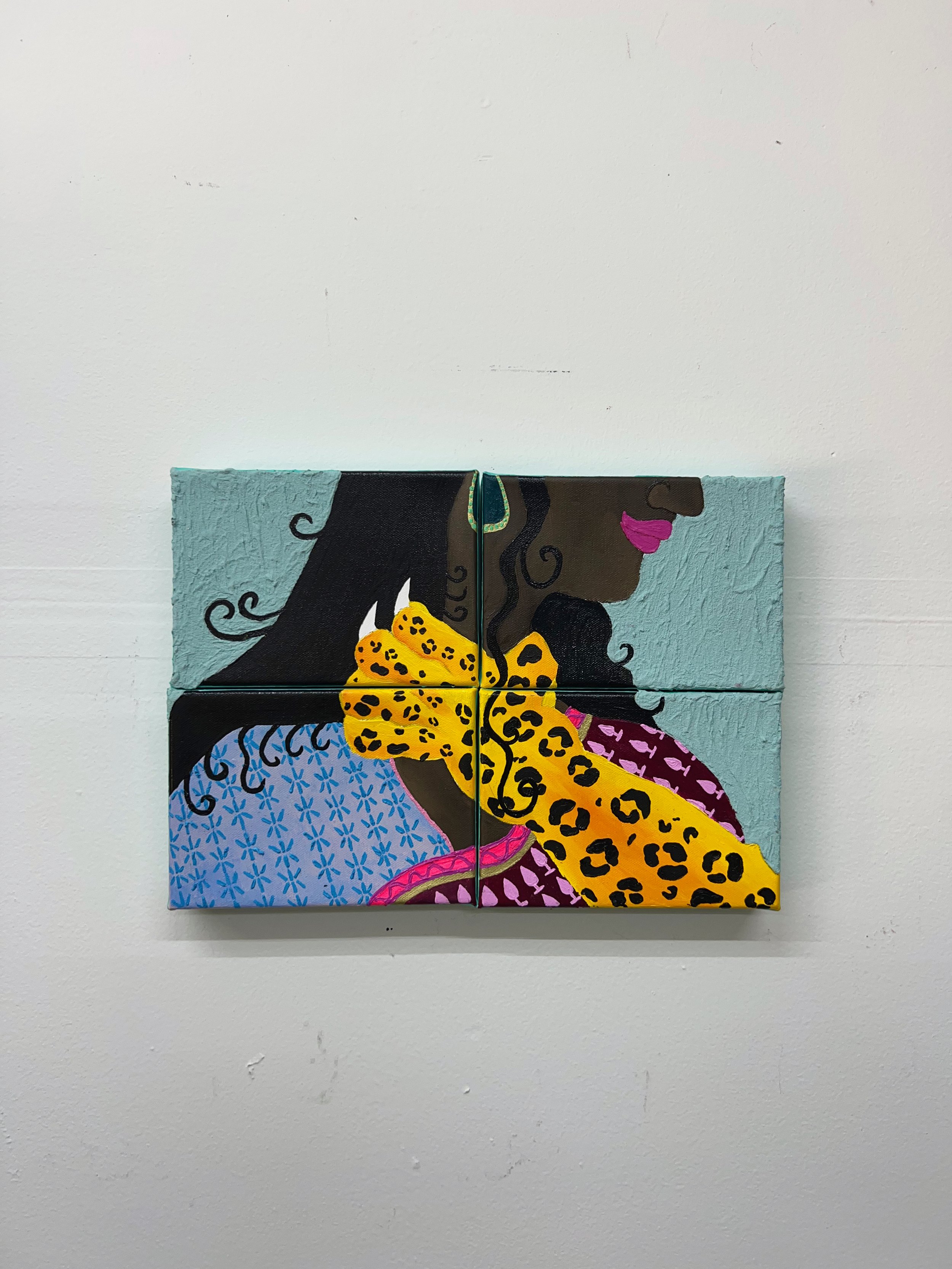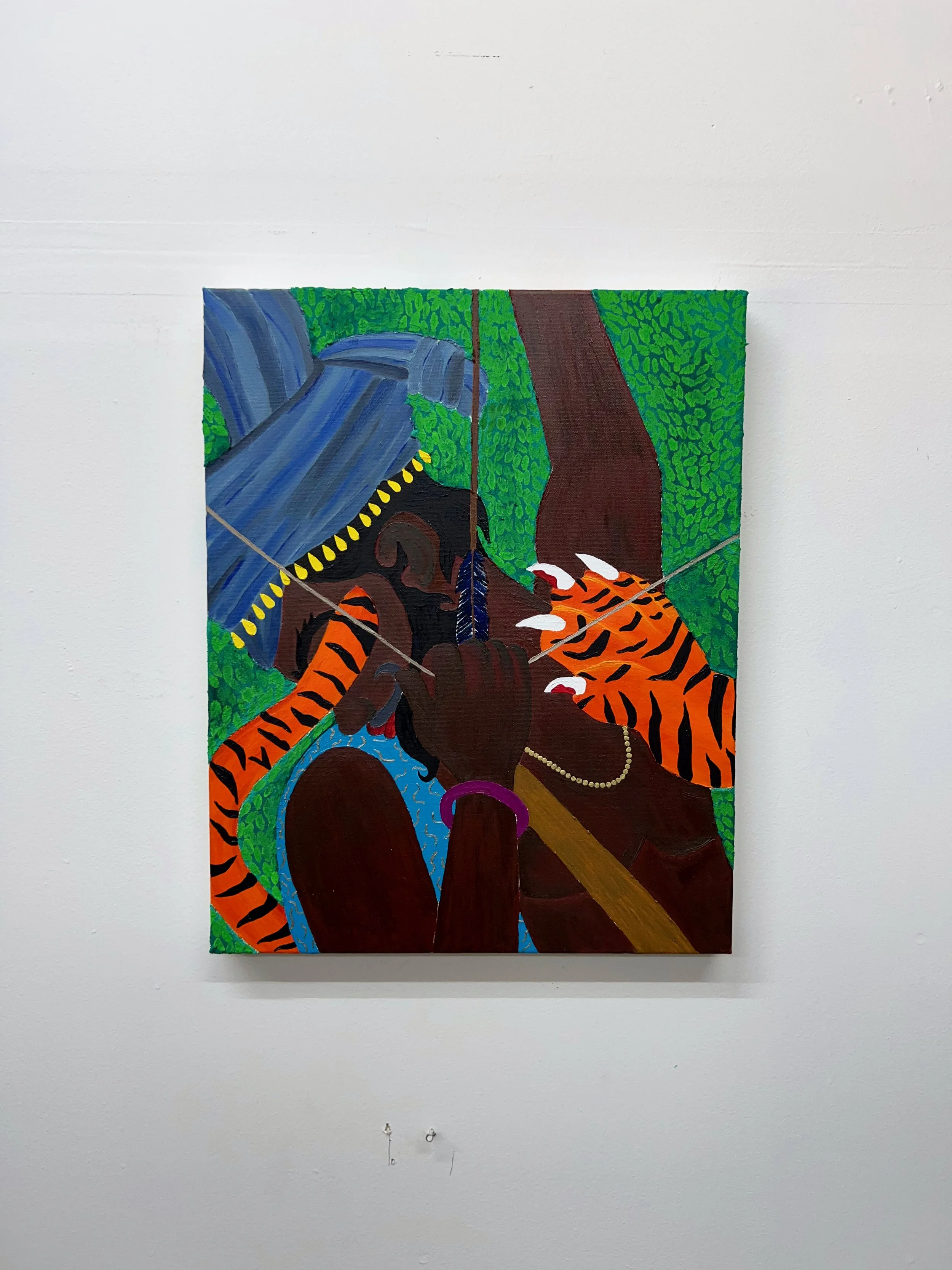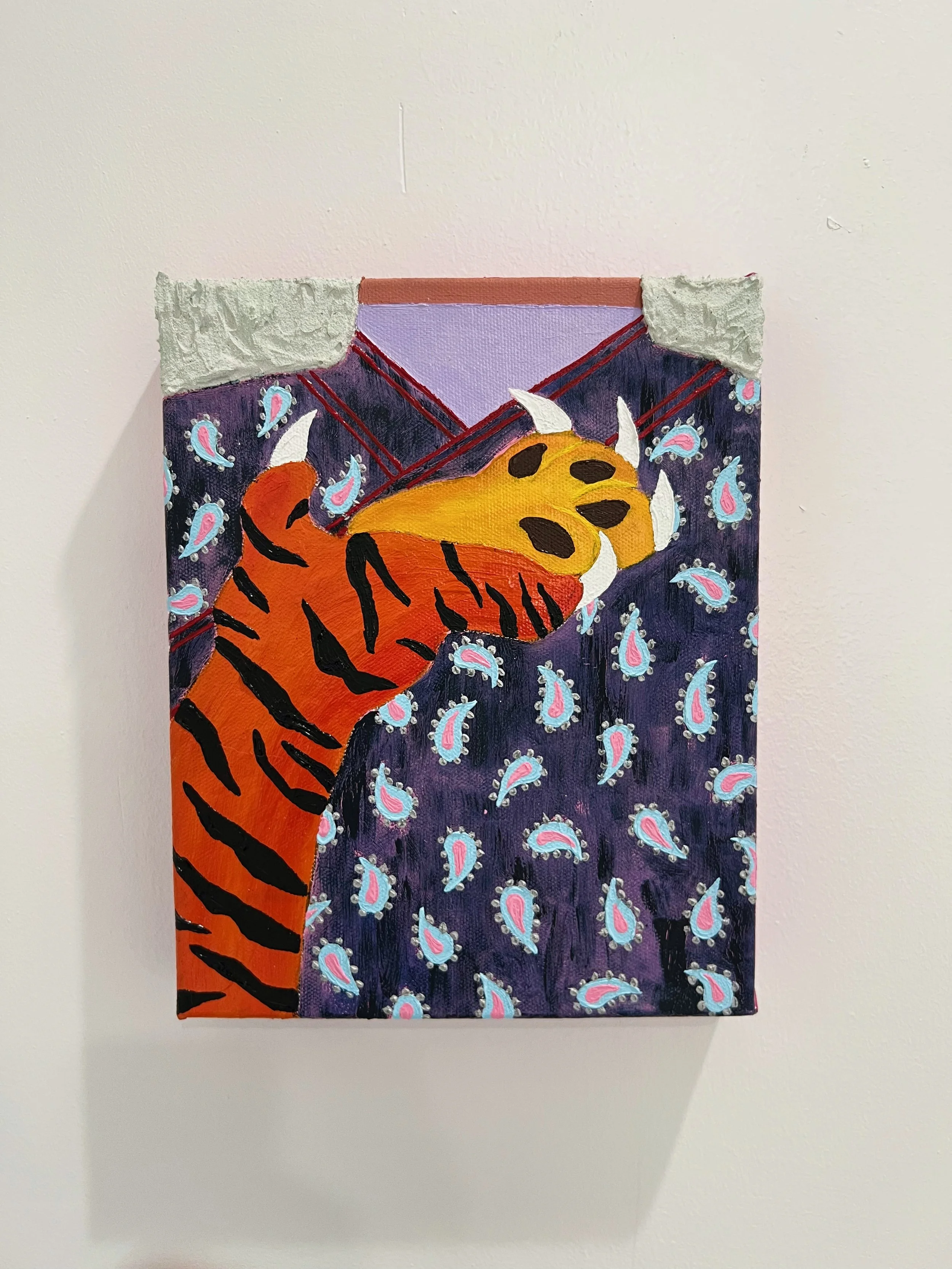 Rendered on small canvases, the portraits feature deliberately cropped torsos, focusing on the neck. This framing introduces a visceral sense of vulnerability and desire, evoking themes of lust, kink, and power dynamics. At the same time, the intricate patterns within the compositions explore the intersections of nature, ornamentation, and authority.